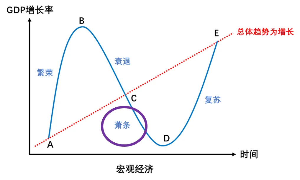 在萧条期,经济增速持续降低,总需求增量持续减少,消费与投资活动变得消极,失业率高企,市场参与者悲观,企业利润与信贷增速持续下降,国际贸易活动低迷。