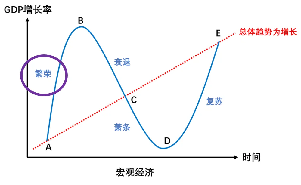 在繁荣期,经济快速增长,总需求旺盛,消费与投资活动积极,就业率高,市场参与者信心十足,企业利润与信贷增速强劲,国际贸易活动持续增加。