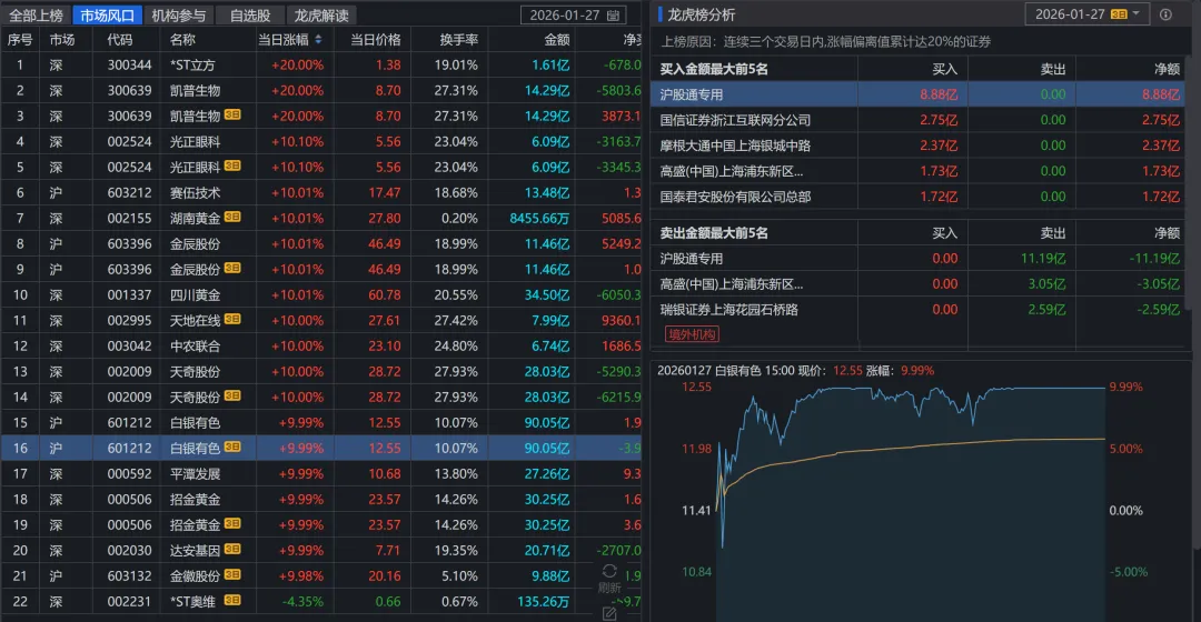 白银有色(6连板):成为市场最高标,引领贵金属板块情绪。