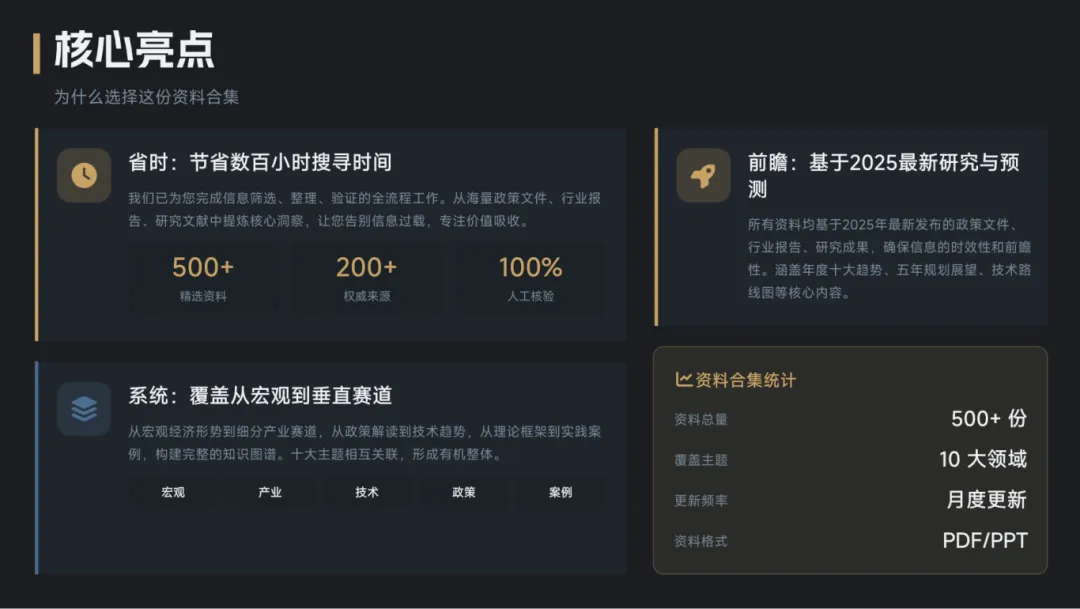 即时访问完整资料库: 一次加入,即可立刻下载上述十大文件夹内的全部高清PDF报告与源文件PPT,总计超过1000+份精选资料,并已经分类整理,为您节省数百小时的信息搜集与甄别时间。