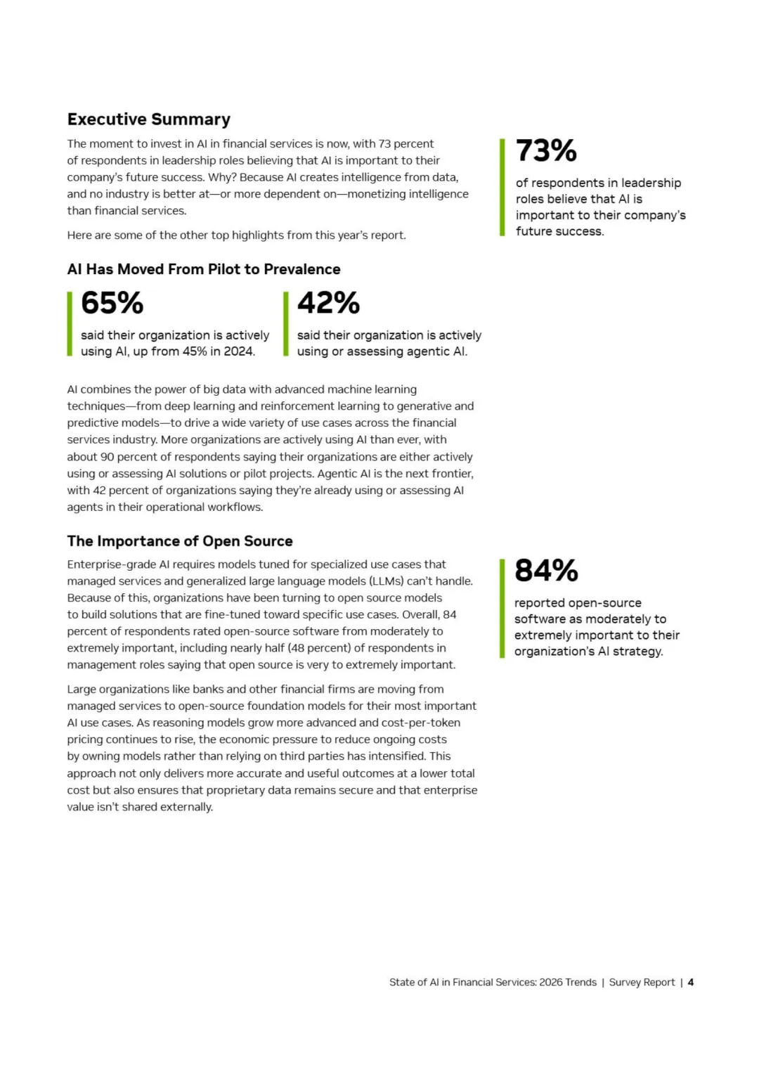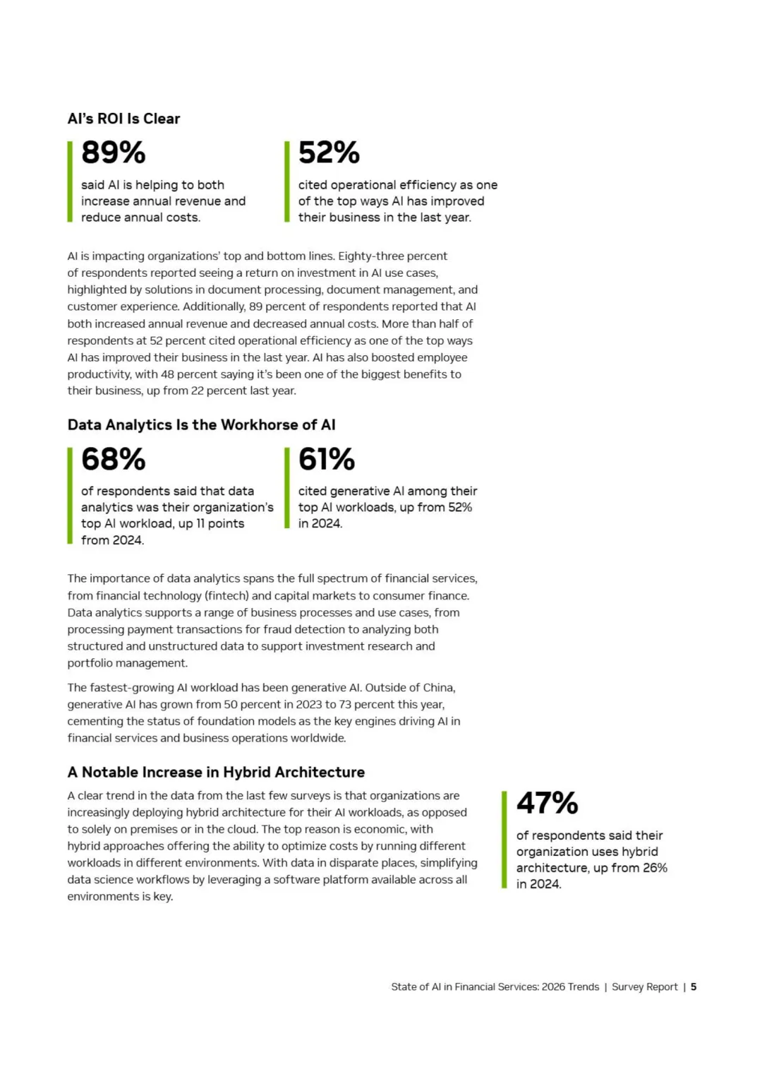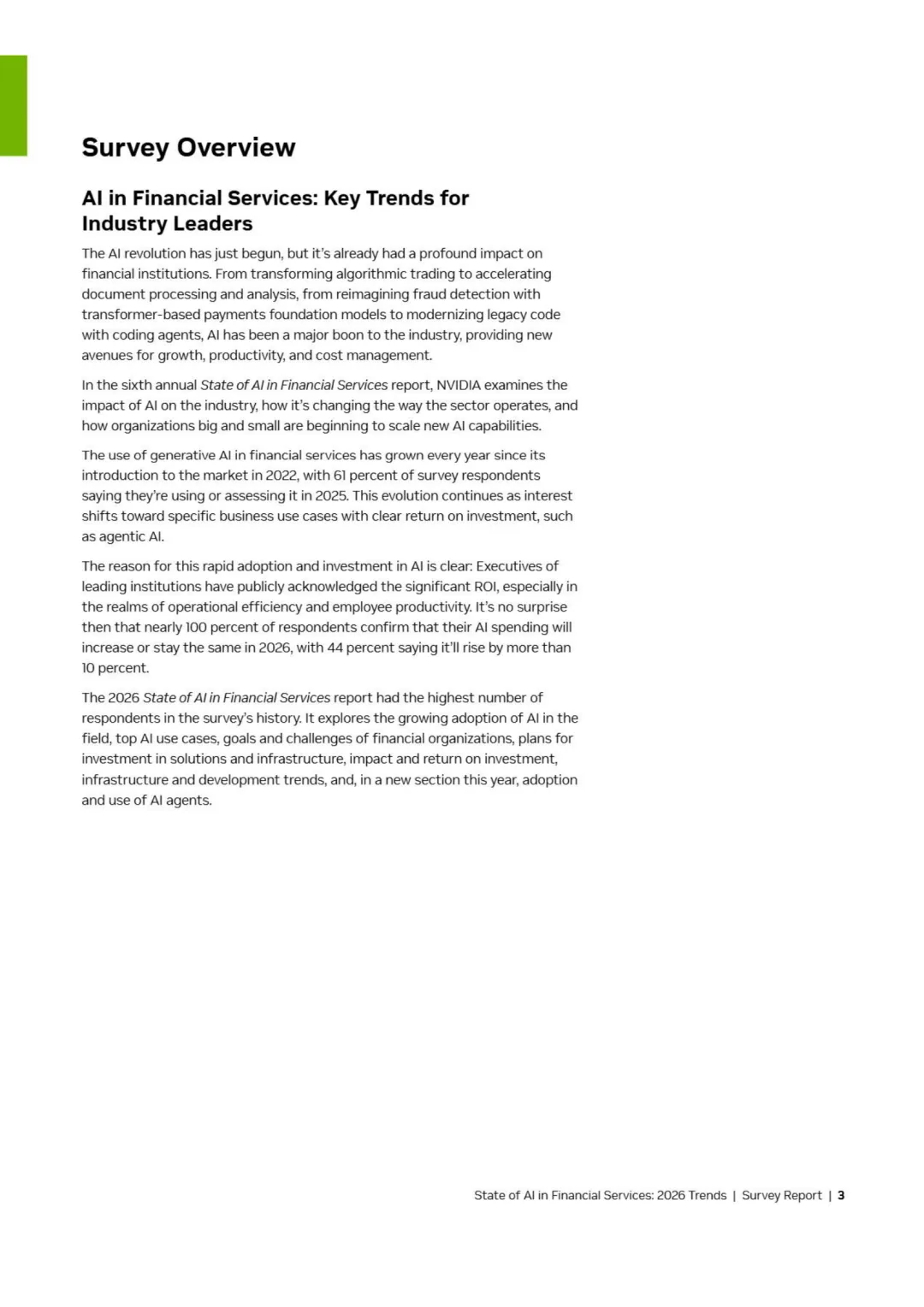 在 AI 技术重塑行业格局的关键节点,NVIDIA《2026 年金融服务人工智能发展报告》(基于 839 家金融机构调研)揭示了行业变革核心方向,为金融从业者、投资者提供高价值决策参考。