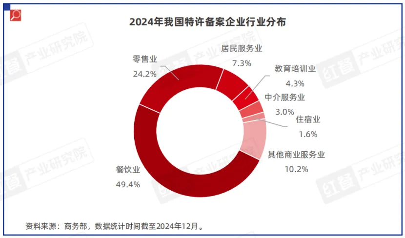 从中国加盟企业的行业结构来看,据商务部数据,餐饮业占比近五成,是加盟市场的主力赛道。同时,加盟模式渗透至多元业态。其中,零售业是第二大行业,占比为24.2%,居民服务业、教育培训业等其他行业占比则相对较少。