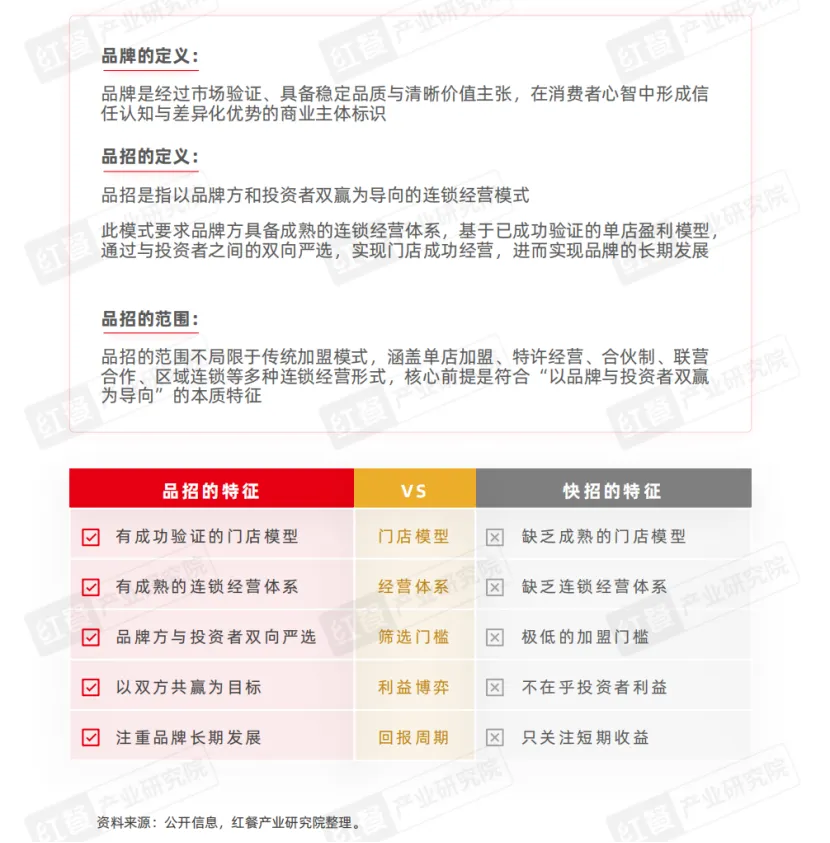其次,在加盟模式方面,“快招”模式逐步出清,行业向品招模式转型。我国的连锁加盟行业在发展的过程中,出现了一些加盟乱象,其中“快招”品牌的“割韭菜”行为,给整个加盟行业的发展带来了负面影响,使得真正有实力、有诚意的品牌在拓展市场时面临更大的挑战,行业迫切需要完善优质项目的标准和特征。