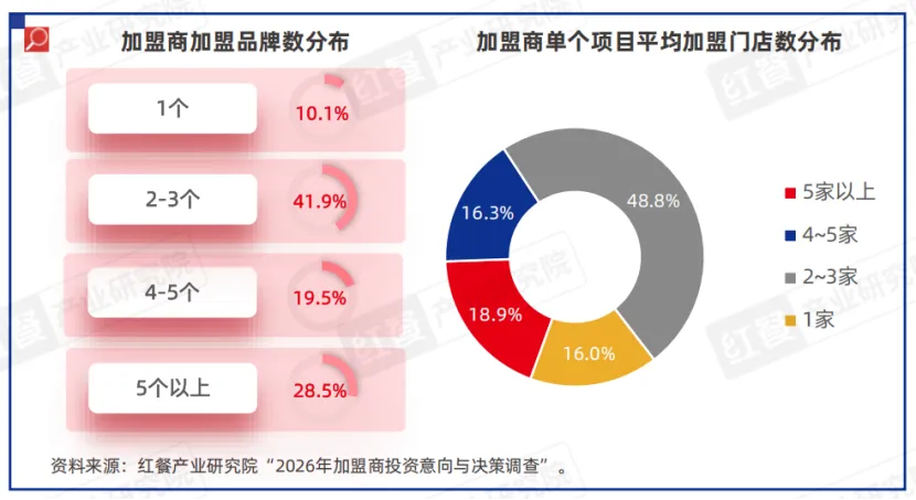 从经营布局来看,多品牌布局已成为加盟行业普遍策略。红餐产业研究院调研发现,近90%的加盟商同时布局了2个及以上品牌。从门店数量维度来看,单项目门店扩张集中度较低,仅48.8%的加盟商在单个项目中布局2~3家门店,单项目门店扩张的集中度相对较低。