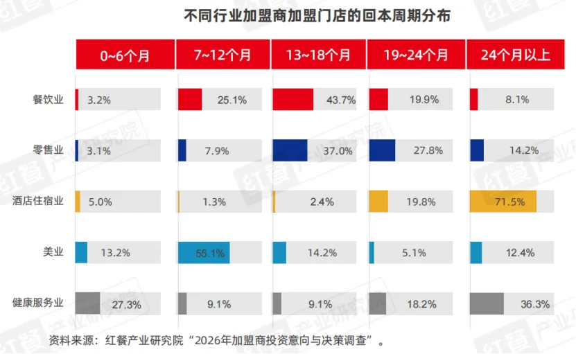 从单店回报周期来看,美业的平均回本周期最短,超过50%的美业加盟商表示其门店在7~12个月内实现回本。酒店住宿业的回本周期则相对较长,71.5%的加盟商表示其门店需两年以上才能回本。不同业态的经营属性导致了不同的盈利节奏。
