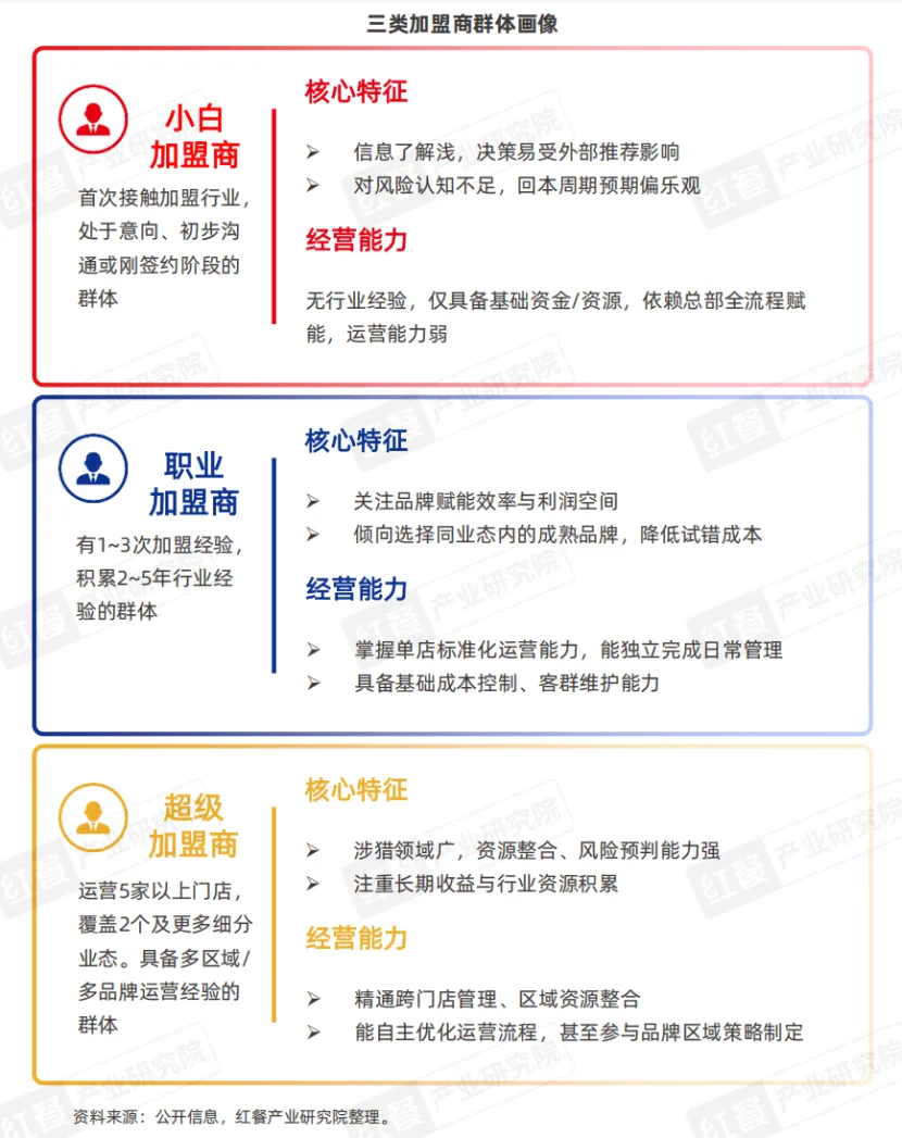目前,连锁加盟行业的投资者主要由加盟小白、职业加盟商、超级加盟商三类群体组成,他们在经验、核心特征和经营能力上存在明显差异,其中职业加盟商和超级加盟商通过丰富的经验、专业的能力和雄厚的资金实力等能力优势,正在逐渐成为加盟市场主流群体。
