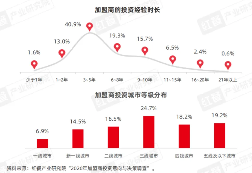 其中,成熟的职业加盟商年龄主要集中在31~40岁,他们的投资经营时长集中在3~5年,占比40.9%。在区域分布上涵盖各个等级的城市,其中三线城市占比较高,占比24.7%。
