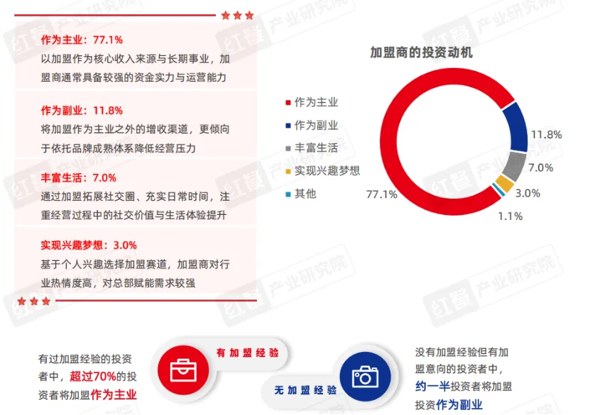 在投资动机方面,据红餐产业研究院调研,77.1%的加盟商将加盟作为主业,以此作为主要收入来源;11.8%的加盟商将其作为副业,是增收的一种方式;另有7.0%和3.0%的加盟商分别出于丰富生活、实现兴趣梦想的目的参与加盟。