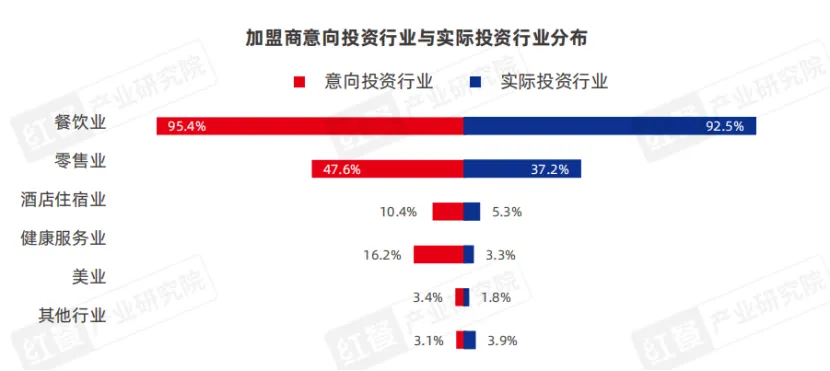 在投资偏好方面,红餐产业研究院“加盟商投资意向与决策调查”结果显示,餐饮行业是大部分加盟商的选择,意向投资与实际投资占比分别达到了95.4%和92.5%。