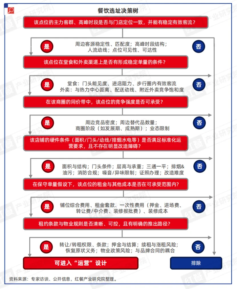 餐饮加盟选址上,不仅是找人多热闹的点位,还要验证是否能跑通单店模型。红餐产业研究院以六维决策树作为筛选维度:有效客流是否匹配目标客群与高峰时段、交易与单量来源是否可靠、竞品与替代压力是否可承受、店型与硬条件能否按标准落地、租金与综合成本是否符合预期、租约条款是否清晰且具备可执行退出路径。以上任何一项不成立,加盟商都需要审慎对待。