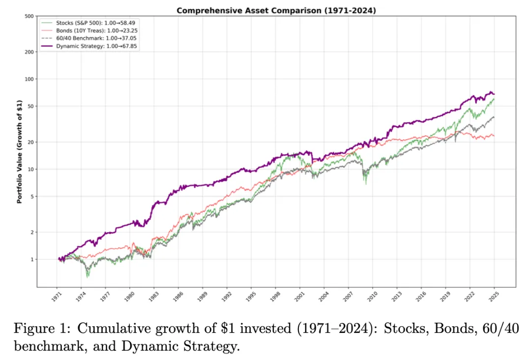 最新《Adaptive Asset Allocation Across Macroeconomic Regimes: A Systematic Solution to the Stock-Bond Correlation Breakdown》(2026年1月)的研究报告,提出了一个应对这一格局的动态框架。该策略基于增长和通胀趋势,在股票、国债和大宗商品之间系统性轮换敞口,回测期覆盖1971年至2024年。