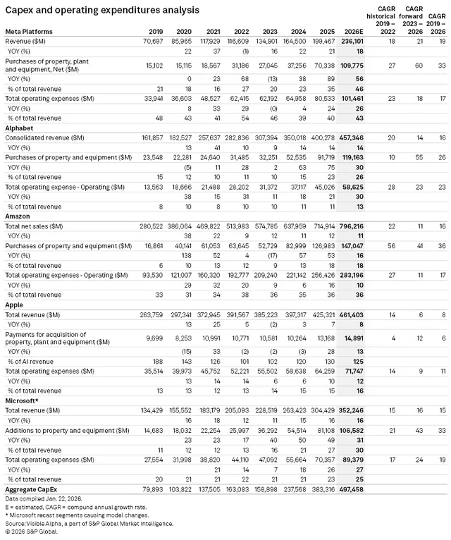 为了支撑生成式 AI 业务,科技巨头们对技术基建的投入需求越来越大,这也让市场对它们 2026 年的资本开支预期持续走高。