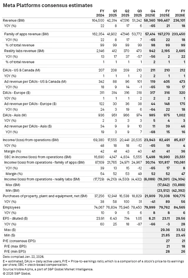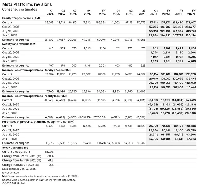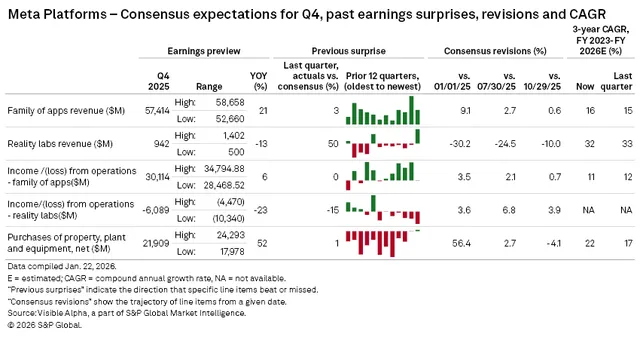 Visible Alpha 的一致预期显示,凭借应用家族板块的稳健表现,Meta 2025 年第四季度总营收预计将达到 583.6 亿美元。