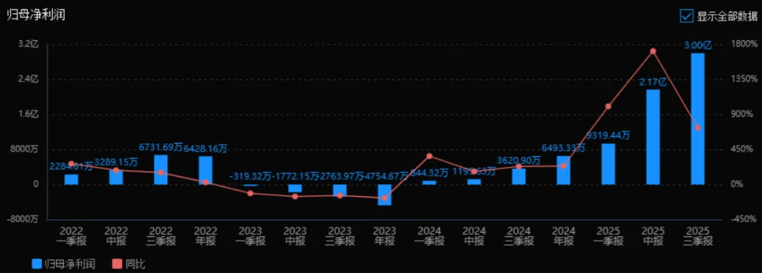 2)归母净利润:2025年三季度的归母净利润为3.00亿元,相较于2024年三季度(3620.90万元)增长了727.74%。评价: 净利润增速远超收入增速,表明公司盈利能力大幅改善,成本控制或规模效应显著。