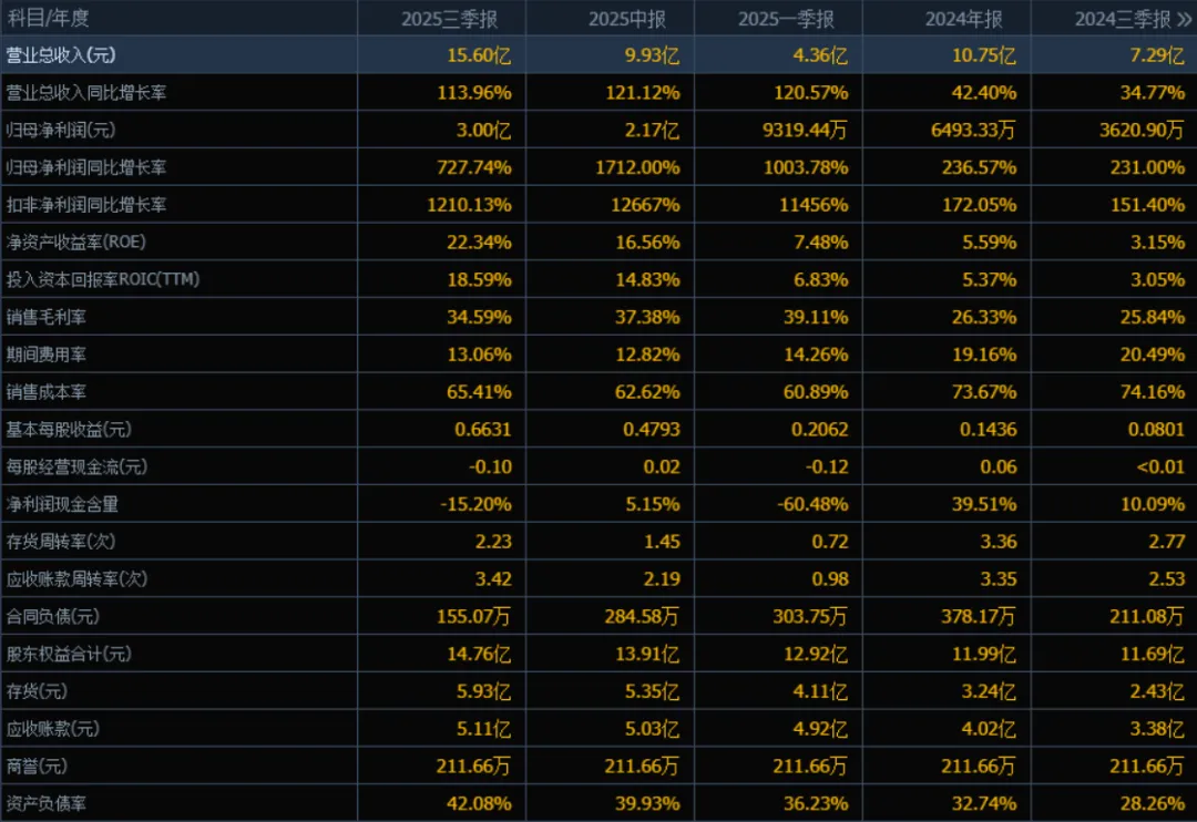 1)营业总收入:2025年三季度的营业总收入为15.60亿元,相较于2024年三季度(7.29亿元)增长了113.96%。评价: 收入增长极为强劲,显示出公司业务扩张迅速或市场需求旺盛。