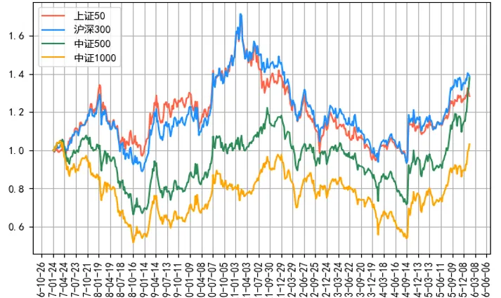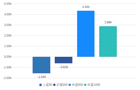 本周,A股主要指数分化较大。上证50下跌1.54%,沪深300下跌0.62%,中证500上涨4.34%,中证1000上涨2.89%。从风格上看,小盘风格强于大盘风格。