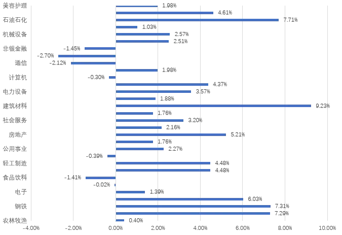 本周,31个申万一级大部分为上涨状态。24个上涨行业中,建筑材料领涨,涨幅为9.23%,其次为石油石化、钢铁、基础化工,涨幅分别为7.71%、7.31%和7.29%。7个下跌行业中,银行领跌,跌幅为2.70%,其次为通信、非银金融,跌幅分别为2.12%、1.45%。