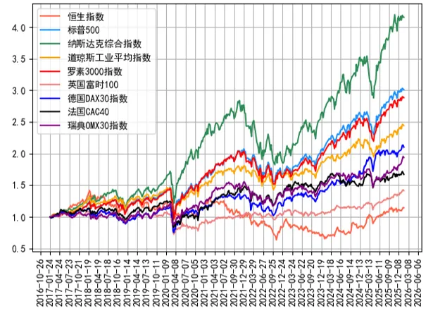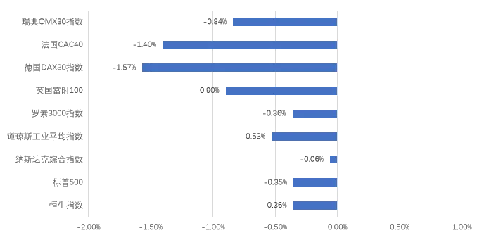 本周,全球主要指数均下跌。德国DAX30指数下跌1.57%,法国CAC40下跌1.4%,英国富时100下跌0.9%,瑞典OMX30指数下跌0.84%,道琼斯工业平均指数下跌0.53%,恒生指数下跌0.36%,罗素3000指数下跌0.36%,标普500下跌0.35%,纳斯达克综合指数下跌0.06%。