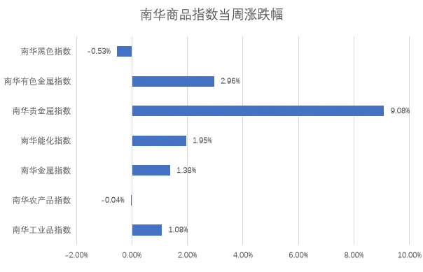 本周,商品市场表现较好。南华贵金属指数上涨9.08%,南华有色金属指数上涨2.96%,南华能化指数上涨1.95%,南华金属指数上涨1.38%,南华工业品指数上涨1.08%,南华黑色指数下跌0.53%,南华农产品指数下跌0.04%。