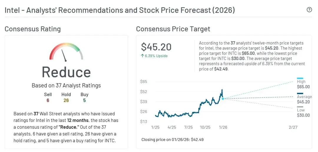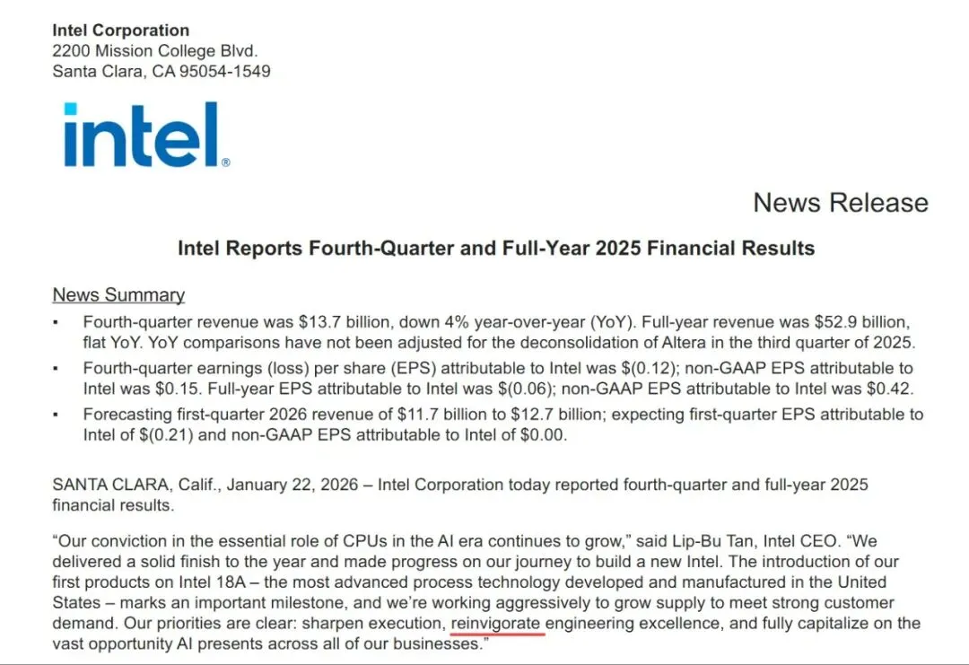 最近英特尔公布了第四季度财报,公司营收 137 亿美元,高于市场一致预期的约 134 亿美元,Non-GAAP 每股收益 0.15 美元、毛利率 37.9%,都好于此前的市场判断。但是!公司对 2026 年第一季度预测的营收中值低于市场预期,股价噼里啪啦跌。