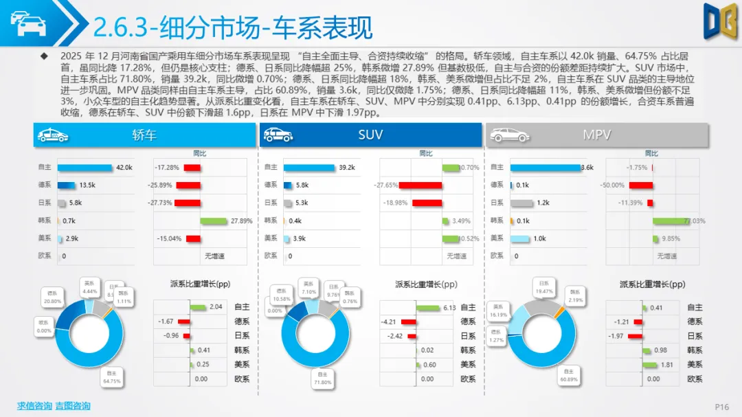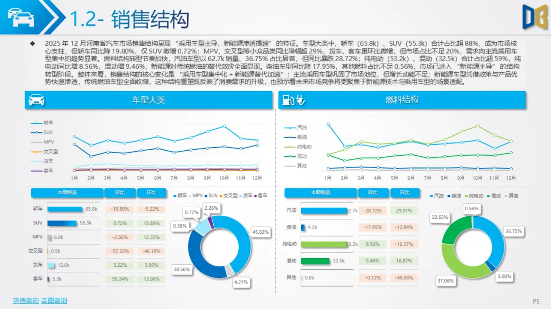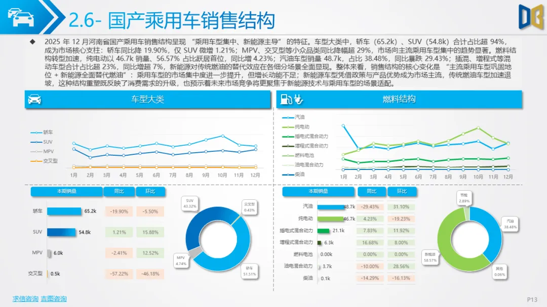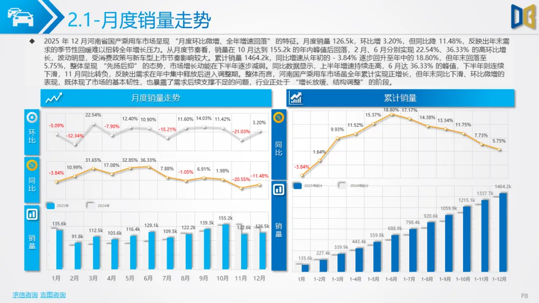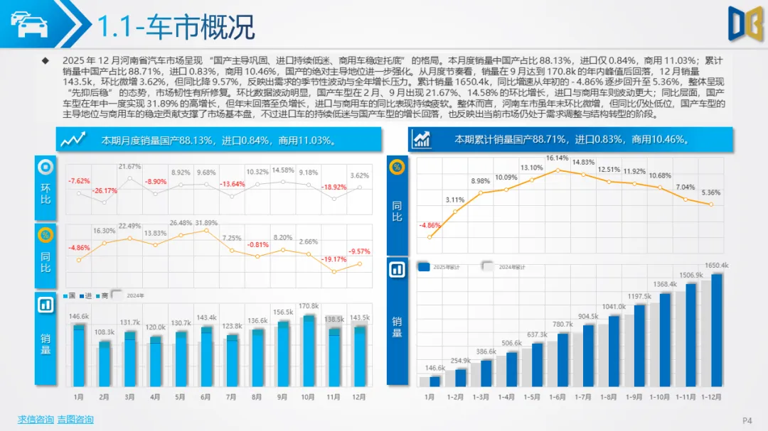 从市场规模来看,2025年12月河南省汽车市场销量达143.5k,环比微增3.62%,但同比下降9.57%,反映出需求的季节性波动与年末增长压力。全年累计销量1650.4k,同比增速从年初的- 4.86% 逐步回升至5.36%,整体呈现 “先抑后稳” 的修复态势。市场结构上,国产车型的绝对主导地位进一步强化,12 月销量占比88.13%,累计占比88.71%;进口车型持续疲软,月度占比仅0.84%,累计占比0.83%;商用车则发挥稳定托底作用,月度占比11.03%,累计占比10.46%。环比数据波动明显,国产车型在2月、9 月分别实现21.67%、14.58%的显著增长,进口与商用车波动更为剧烈。