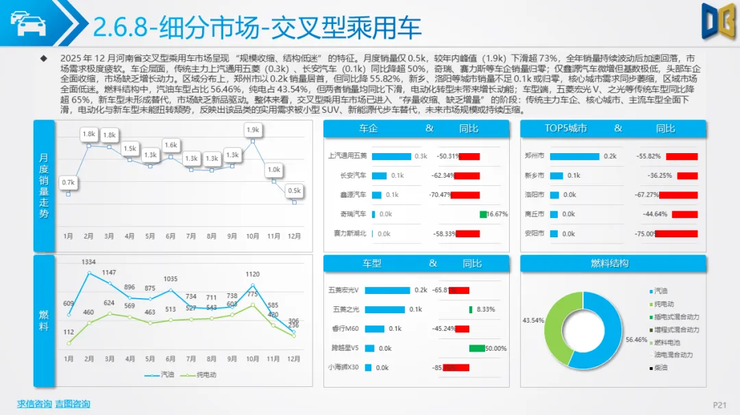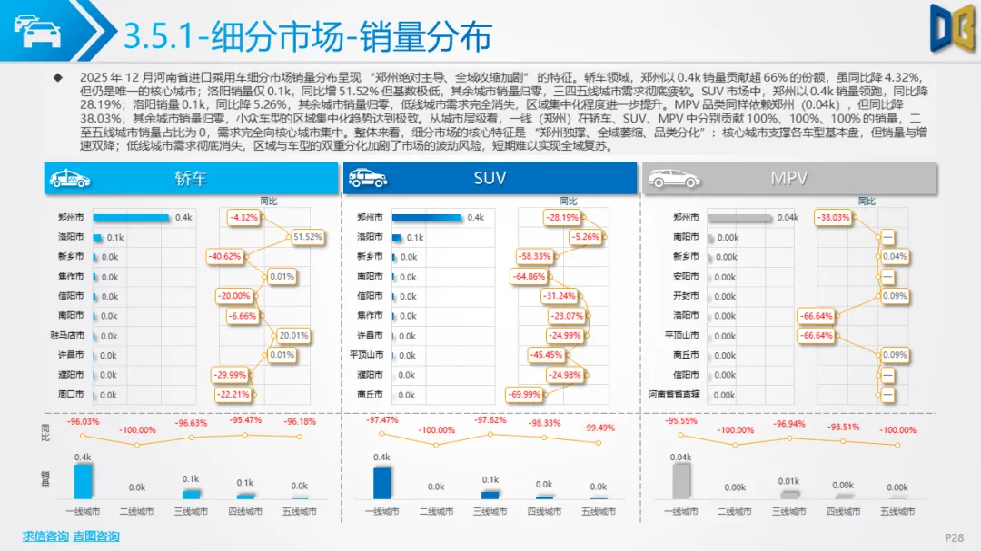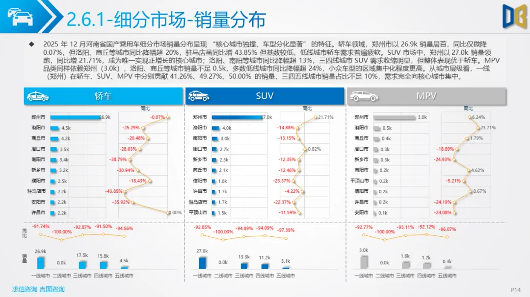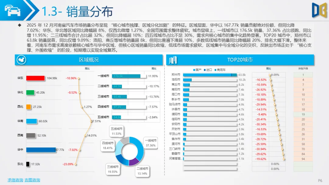 车型大类中,轿车(65.8k)、SUV(55.3k)合计占比超88%,成为市场核心支柱,但轿车同比降19.80%,仅 SUV微增0.72%;MPV、交叉型等小众品类同比降幅超29%,需求向主流乘用车型集中趋势显著。燃料结构转型成效凸显,汽油车型虽以62.7k销量居首,但同比暴跌28.72%;纯电动(53.2k)、混动(32.5k)合计占比超59%,其中纯电动同比增8.56%,混动增9.46%,新能源对传统燃油的替代效应全面显现。区域分布上,市场呈现 “核心城市独撑、区域分化加剧” 的特征。华中区域以 167.77k 销量贡献绝对份额,但同比降7.02%;全国范围内华东、华北等区域同比降幅超8%,仅西北微增1.27%。城市层级中,一线城市(郑州)以176.5k销量、37.36%占比领跑,同比增11.95%;二三线城市合计占比超32%但同比降幅超10%,四五线城市占比不足30%,需求向核心城市集中化趋势显著。