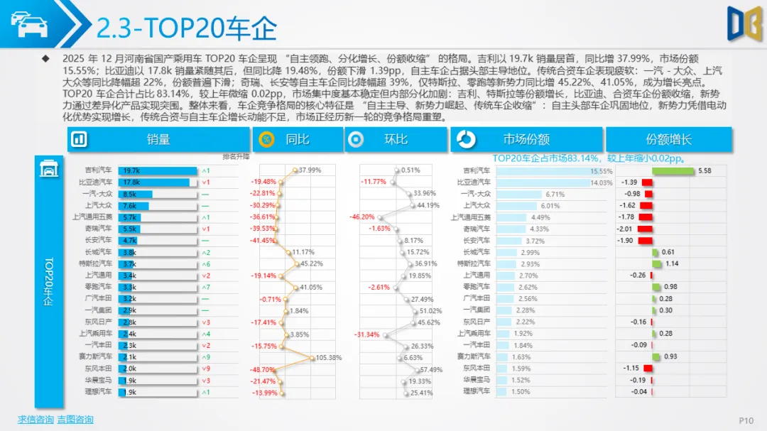 动力总成方面,呈现 “纯电主导、传统燃油收缩” 的特征。1.5L排量以49.8k销量、39.96%占比居首,但同比降15.43%;0.0排量(纯电)以46.7k销量、36.96%占比紧随其后,同比微增4.23%,形成 “双核心” 格局。变速箱端,1AT(适配纯电)以59.0k销量、46.68%占比绝对领跑,同比增11.35%;7DCT、CVT等传统燃油适配变速箱同比降幅超23%,纯电适配变速箱已成为主流配置。竞争格局上,TOP20车企呈现 “自主领跑、分化增长、份额收缩” 的格局。吉利以 19.7k 销量居首,同比增37.99%,市场份额15.55%;比亚迪以17.8k销量紧随其后,但同比降19.48%。传统合资车企表现疲软,一汽-大众、上汽大众等同比降幅超22%;新势力成为增长亮点,特斯拉、零跑等同比增45.22%、41.05%。车系表现则呈现 “自主绝对主导、合资全面收缩” 的格局,自主车系以 85.4k 销量、67.77%占比绝对领跑,德系、日系等合资车系同比降幅超22%,市场向自主车系集中趋势彻底固化。