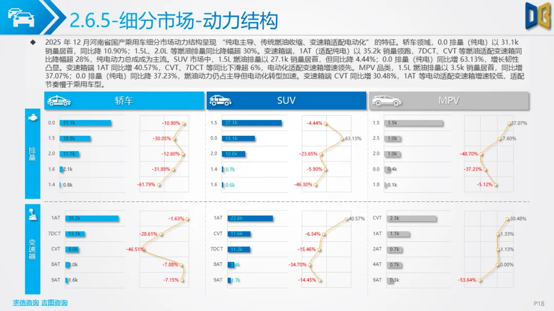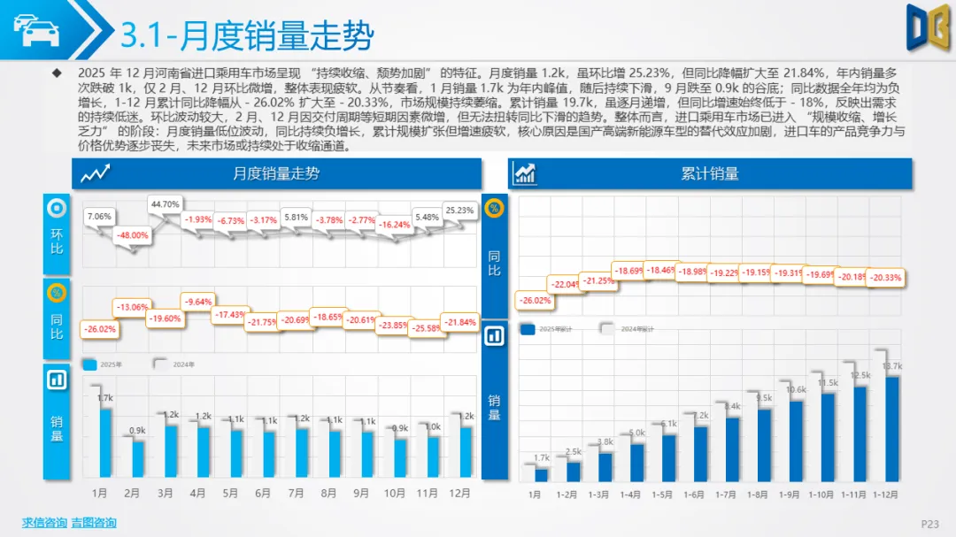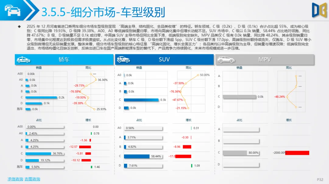 2025年12月河南省进口乘用车市场颓势加剧,月度销量1.2k,虽环比增25.23%,但同比降幅扩大至21.84%。全年销量多次跌破1k,仅 2 月、12 月环比微增,1 月销量1.7k为年内峰值,随后持续下滑,9 月跌至0.9k谷底。累计销量19.7k,虽逐月递增,但同比增速始终低于- 18%,需求持续低迷,核心原因是国产高端新能源车型的替代效应加剧,进口车产品竞争力与价格优势逐步丧失。动力总成呈现 “燃油主导、电动缺失、结构僵化” 的突出问题。2.0L 排量以0.8k销量、62.84%占比绝对领跑,同比增21.09%;3.0L排量占比33.08%,但同比降11.33%;0.0排量(纯电)销量为0,电动化转型完全滞后。变速箱端,8AT以0.5k销量、39.47%占比居首,同比降32.39%;CVT、9AT等传统燃油适配变速箱占比超44%,但同比普遍下滑,7DCT降幅达42.28%,