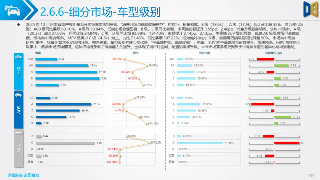 2025年12月河南省汽车市场的运行态势,折射出行业转型期的三大核心趋势。一是新能源替代不可逆,无论是乘用车还是商用车,新能源车型均实现销量与占比的双重提升,纯电、混动、燃料电池等多技术路线并行发展,传统燃油车型加速退坡,燃料结构转型进入深水区;二是市场分化加剧,国产与进口车型表现冰火两重天,自主车企在技术迭代与产品创新中巩固主导地位,进口车因转型滞后面临份额持续流失,同时核心城市与低线市场的需求分化、主流车型与小众品类的结构分化进一步凸显;三是消费与需求升级,乘用车市场中高端级别份额提升,商用车市场物流场景专业化需求显现,用户对空间、配置、智能化、环保性的要求持续提高,驱动市场向高质量发展转型。
