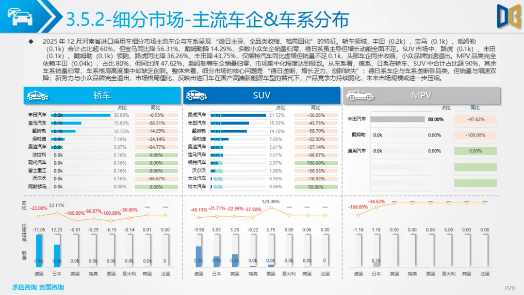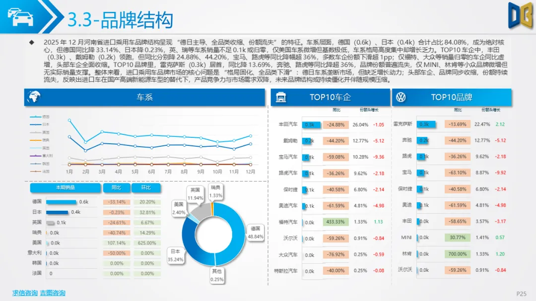 动力总成配置缺乏创新。品牌结构呈现 “德日主导、全品类收缩、份额流失” 的特征。德国(0.6k)、日本(0.4k)合计占比84.08%,成为绝对核心,但德国同比降33.14%、日本降0.23%,英、瑞等车系销量不足0.1k或归零。TOP10车企中,丰田(0.3k)、戴姆勒(0.2k)领跑,但同比分别降24.88%、44.20%,多数车企份额下滑超1pp;TOP10品牌里,雷克萨斯(0.3k)居首,同比降13.69%,奔驰、路虎等同比降超36%,仅小众品牌微增但无实际销量支撑。销售结构上,轿车(0.6k)、SUV(0.5k)合计占比超95%,成为市场核心支柱,但轿车同比降7.27%,SUV降32.46%,MPV销量仅0.1k且同比降35.29%。燃料结构僵化问题严重,汽油车型以1.0k销量、84.25%占比绝对领跑,但同比降20.19%。