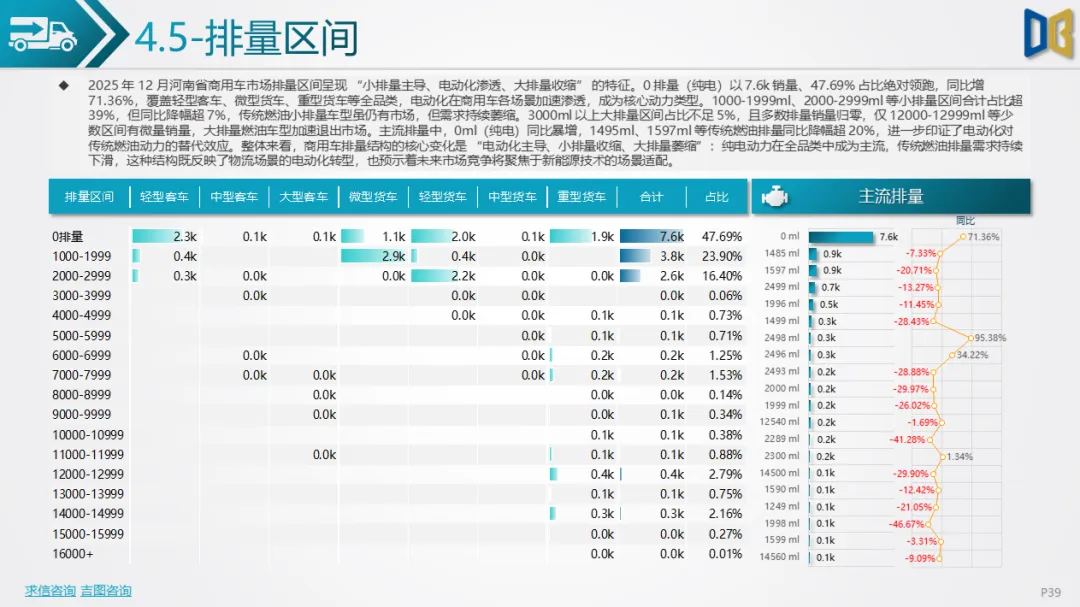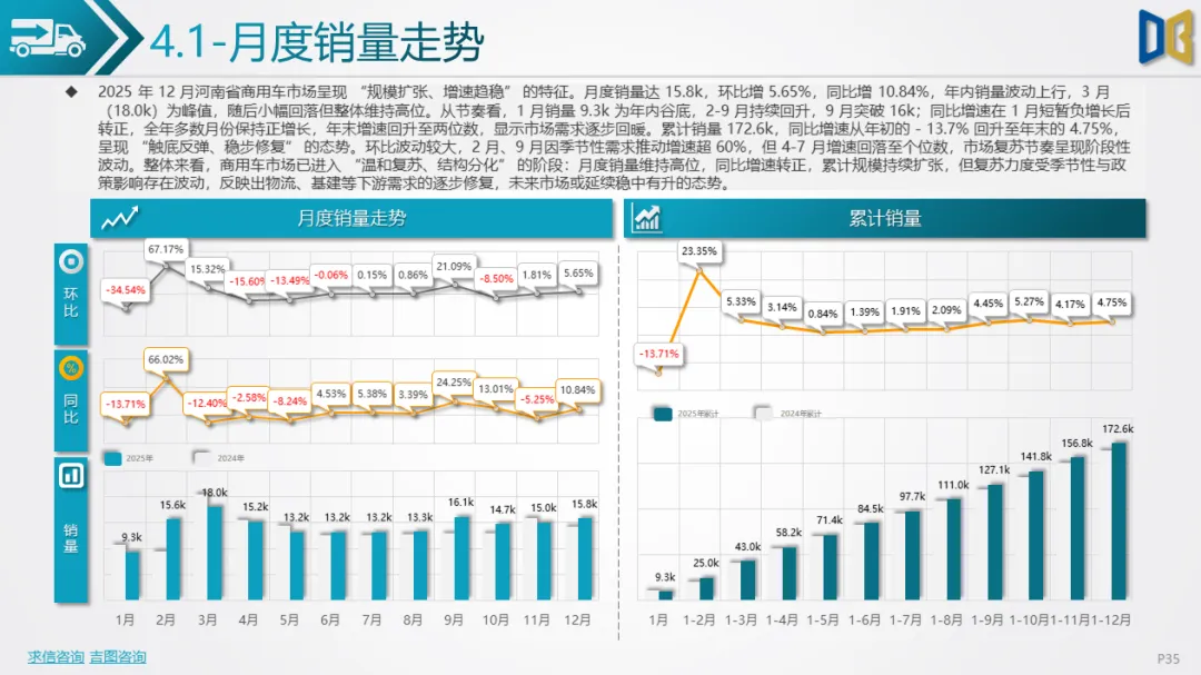 2025年12月河南省商用车市场呈现 “规模扩张、增速趋稳” 的特征,月度销量达 15.8k,环比增5.65%,同比增10.84%。全年销量波动上行,3 月(18.0k)为峰值,1 月(9.3k)为谷底,2-9月持续回升,9 月突破16k;同比增速在1月短暂负增长后转正,年末回升至两位数,显示市场需求逐步回暖。累计销量172.6k,同比增速从年初的- 13.7% 回升至年末的4.75%,呈现 “触底反弹、稳步修复” 的态势,反映出物流、基建等下游需求的逐步修复。车型结构呈现 “货车主导、新能源突破、传统燃料收缩” 的特征。