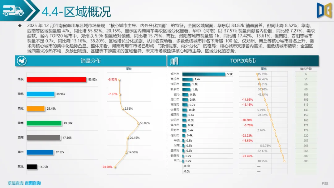 区域市场呈现 “核心城市主导、内外分化加剧” 的特征。全国区域层面,华东以 83.82k 销量居首但同比降8.52%,华南、西南同比增55.82%、20.15%,区域分化显著;华中(河南)以37.57k销量贡献省内份额,同比降7.27%。省内TOP20城市中,郑州以5.9k销量绝对领跑,同比增15.79%,商丘、洛阳等城市销量超1k且同比正增长,但南阳、安阳等城市销量不足0.7k且同比下滑,需求向核心城市集中化趋势凸显。