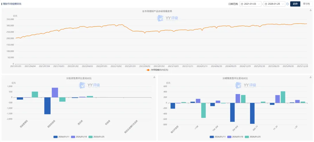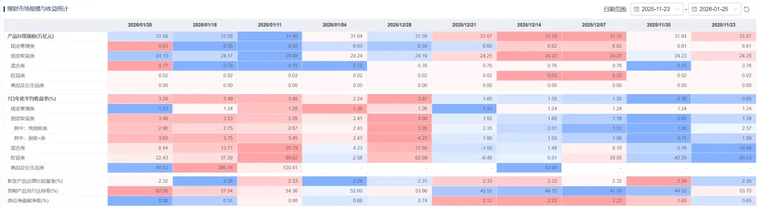 1、截至2026年01月25日,全市场理财产品存续规模为31.58万亿元,较上周增加260.82亿元。分投资性质来看,现金管理类产品规模增加529.24亿元,固收类产品规模减少391.08亿元,混合类产品规模增加123.31亿元。分期限类型来看,本周每日开放型、1M以内、1M-3M、3M-6M、6M-1Y、1Y-3Y、3Y以上产品规模分别增加27.75亿元、减少548.46亿元、减少19.88亿元、增加288.89亿元、增加44.25亿元、增加422.38亿元、增加45.76亿元。 2、本周全市场理财产品7日平均年化收益率为3.28%,较上周下行20.63bp。具体来看,本周现金管理类产品7日年化收益率为1.23%,较上周下行0.98bp;固收类产品收益率较上周下行5.82bp至3.48%,纯固收类及固收+类产品收益率分别较上周上行21.31bp、下行12.56bp至2.96%、3.62%;混合类产品较上周下行533.03bp至8.44%。 3、业绩基准方面,本周全市场新发产品业绩比较基准为2.32%,较上周的2.28%有所上行。到期兑付方面,本周共计7,849款产品到期,平均兑付收益率较上周上行3.86bp至2.54%,到期产品平均兑付达标率环比提升5.02个百分点至62.56%。产品破净方面,单位净值破净率环比下降0.21个百分点至0.30%。