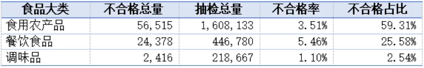 餐饮食品的不合格率位居所有大类之首,问题直接关系到消费者“舌尖上的安全”。