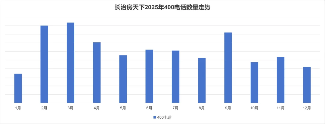2025年长治房天下400电话数量3月为最高值,表明潜在购房者的主动咨询意愿增强,9月份作为传统地产旺季,受各项目营销活动刺激,短暂进入高峰,但热度缺乏持续性。