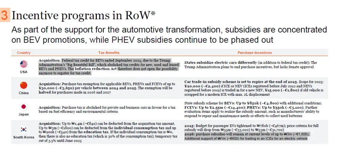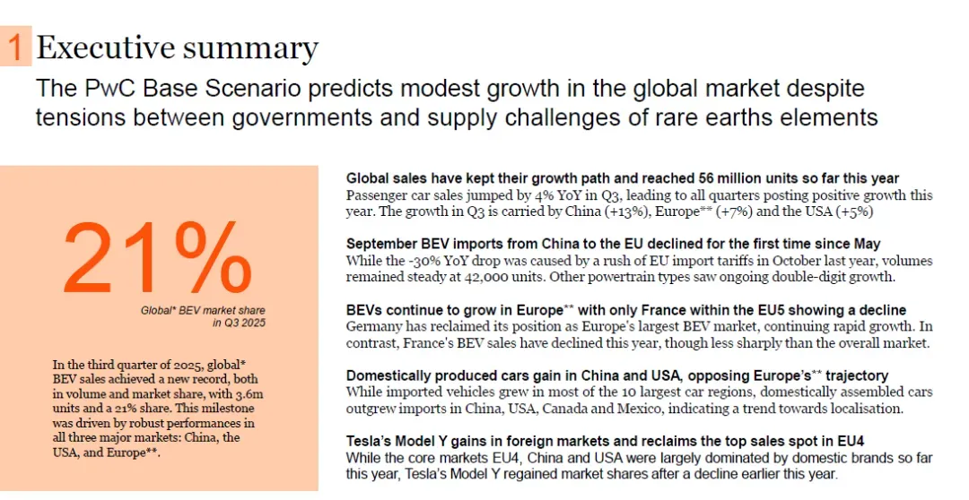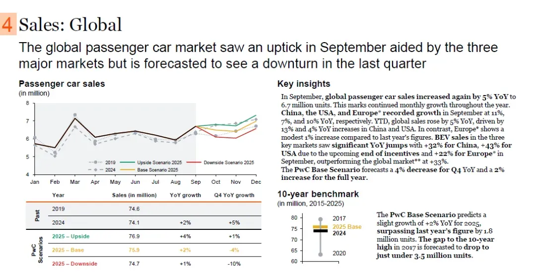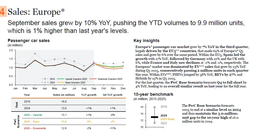 销量增长主要由电动汽车(EV)推动,第三季度EV总销量同比增长31%(BEV +45%、PHEV +82%、Hybrid +12%),市场份额合计达59%;内燃机汽车(ICE)销量自2024年11月以来持续同比下降,9月进一步下降6%。目前关于重新推出BEV购车激励的讨论正在进行,未来BEV销量可能进一步提升。普华永道基础情景预测,2025年第四季度德国乘用车销量同比增长1%,全年销量与2024年基本持平。