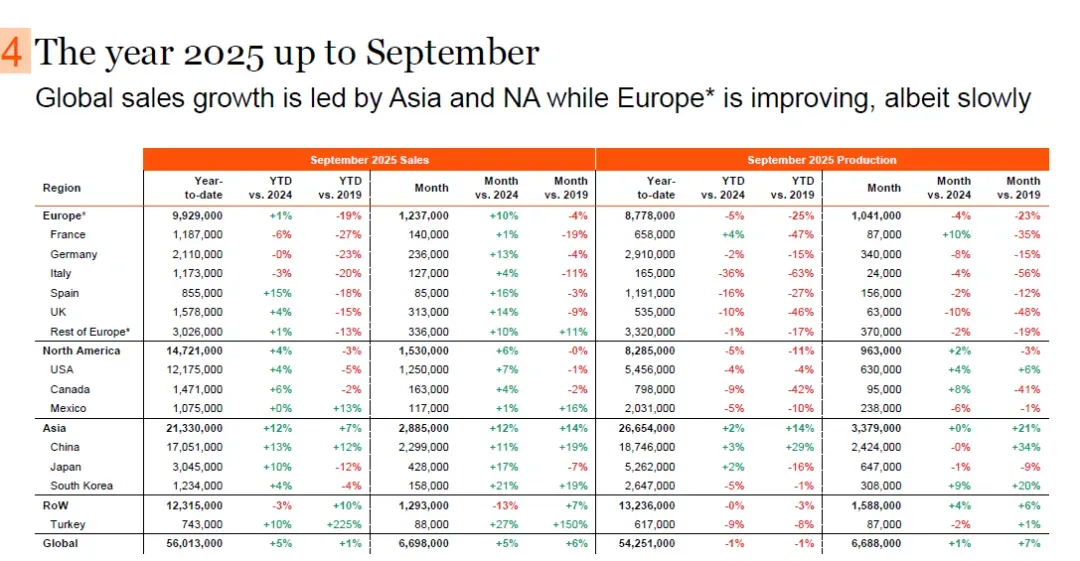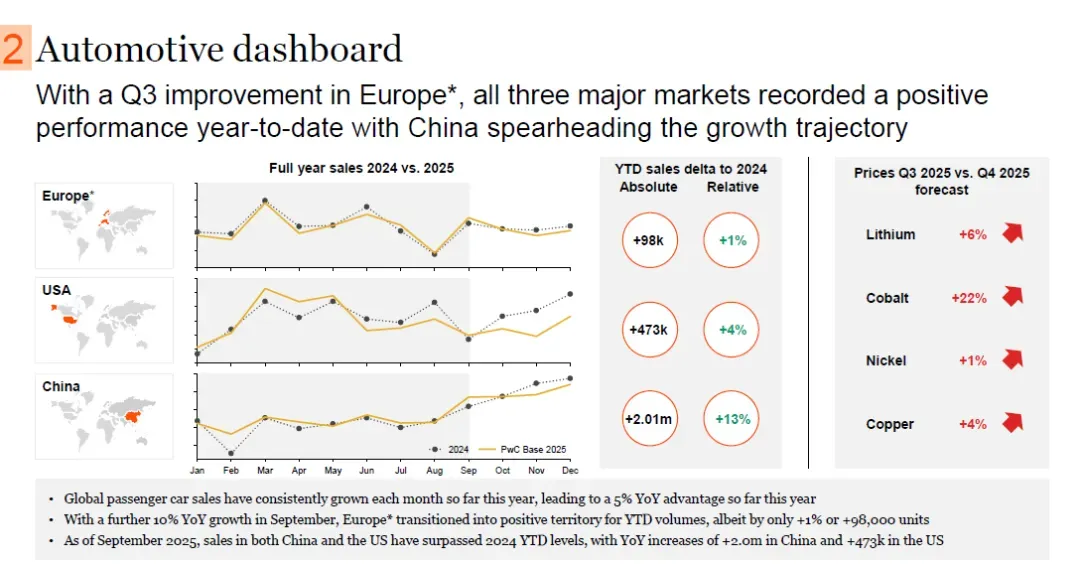 2025年得益于欧洲第三季度的改善,中、美、欧三大主要市场年初至今均录得积极表现,其中中国引领增长态势。与2024年相比,2025年年初至今欧洲汽车销量增加9.8万辆,同比增长1%;美国增加47.3万辆,同比增长4%;中国增加201万辆,同比增长13%。