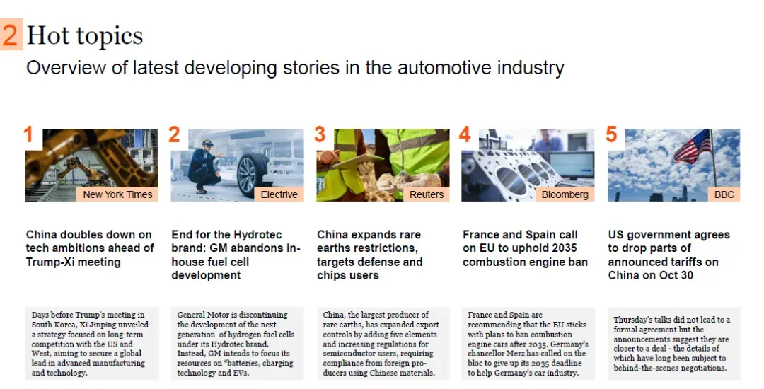 欧盟前五市场销量中,BEV占16%、PHEV占9%、HEV占38%、ICE占38%。德国销量中,BEV占18%、PHEV占10%、HEV占29%、ICE占43%。欧盟前五生产领域中,BEV占39%、PHEV占35%、HEV占8%、ICE占19%。美国销量中,BEV占78%、PHEV占12%、HEV及ICE占比未明确单独列出。