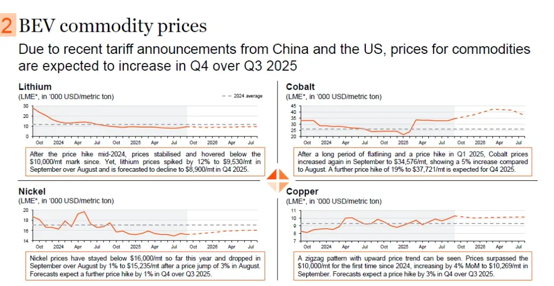 2025年第三季度与第四季度预测价格对比显示,锂价预计上涨6%,钴价预计上涨22%,镍价预计上涨1%,铜价预计上涨4%。