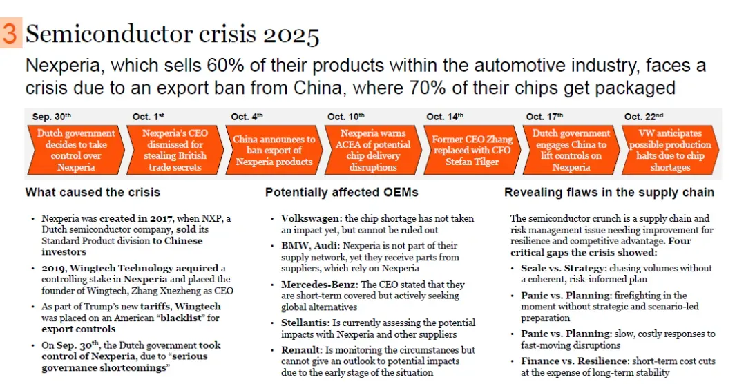 9月30日,荷兰政府以“严重治理缺陷”为由接管Nexperia。 10月1日,Nexperia首席执行官因“窃取英国商业机密”被解雇(Nexperia于2017年由荷兰半导体公司恩智浦(NXP)将其标准产品部门出售给中国投资者成立,2019年闻泰科技收购其控股权,并任命闻泰科技创始人张学政为首席执行官,且因特朗普新关税政策,闻泰科技被列入美国出口管制“黑名单”)。 10月4日,前首席执行官张学政被首席财务官斯特凡·蒂尔格(Stefan Tilger)取代; 10月10日,中国决定对Nexperia实施出口管制,可能导致芯片交付中断; 10月14日,欧洲汽车制造商协会(ACEA)与中国接触,寻求解除对Nexperia的管制,以防芯片短缺导致生产停滞。