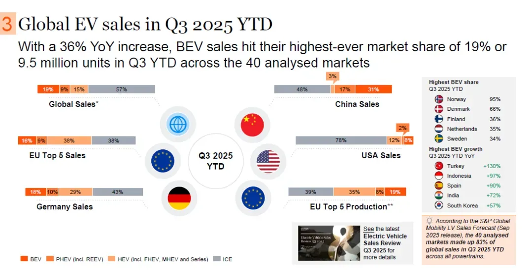 2025年第三季度年初至今,在40个受分析市场中,纯电动汽车(BEV)销量同比增长36%,达950万辆,市场份额达19%,创下历史最高水平(注:根据标普全球移动(S&P Global Mobility)2025年9月发布的轻型车销量预测,这40个受分析市场占2025年第三季度年初至今所有动力系统全球销量的83%)。