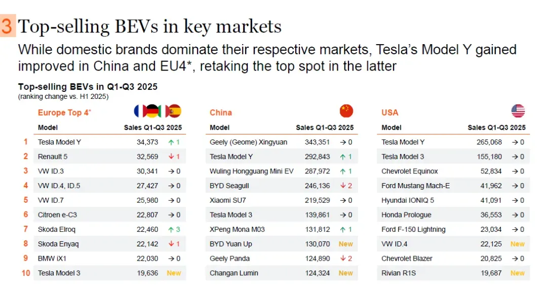 在中国,吉利(极氪)星越以343,351辆销量排名第一,排名未变;特斯拉Model Y以292,843辆排名第二,排名上升1位;五菱宏光Mini EV以287,972辆排名第三,排名上升1位;比亚迪海鸥以246,136辆排名第四,排名下降2位;小米SU7以219,529辆排名第五,排名未变;特斯拉Model 3以139,861辆排名第六,排名未变;小鹏Mona M03以131,812辆排名第七,排名上升1位;比亚迪元UP以130,070辆排名第八,为新进入榜单车型;吉利熊猫以124,890辆排名第九,排名下降2位;长安Lumin以124,324辆排名第十,为新进入榜单车型。