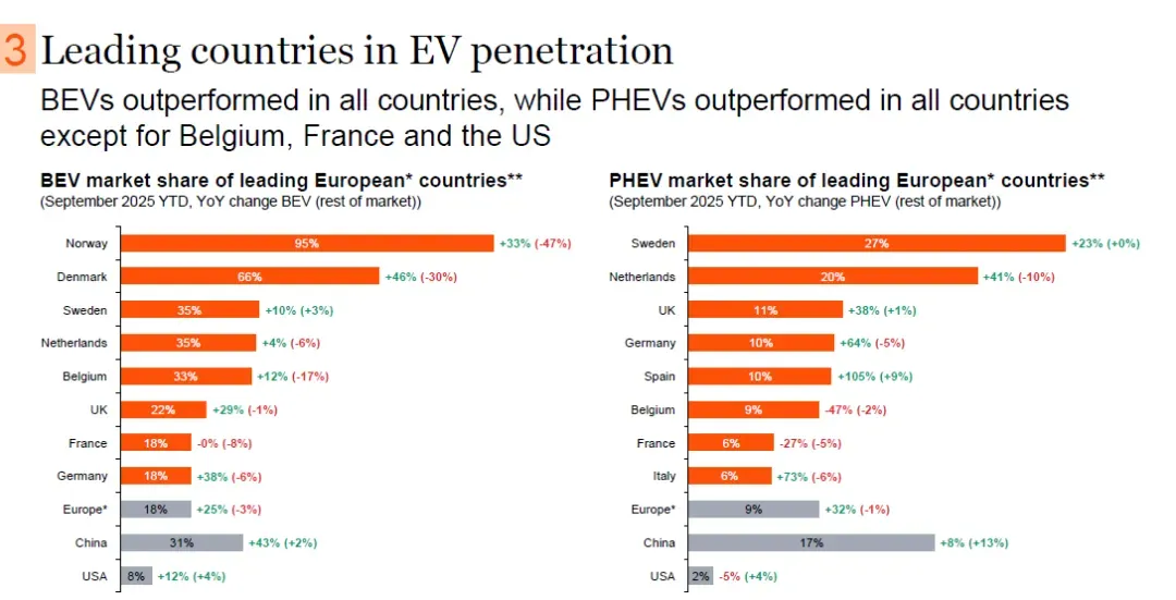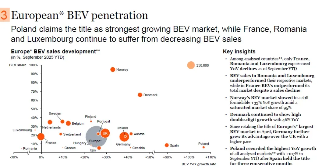 波兰成为欧洲纯电汽车(BEV)销量增长最强劲的市场;法国、罗马尼亚和卢森堡则持续面临BEV销量下降的局面。截至2025年9月年初至今,在受分析国家中,仅法国、罗马尼亚和卢森堡的BEV销量同比下降。罗马尼亚和卢森堡的BEV销量表现不及各自整体市场,而法国尽管BEV销量下降,但表现优于其整体市场。挪威BEV市场份额已达95%,虽市场趋于饱和,但销量仍同比增长33%。丹麦BEV销量保持高两位数增长,同比增幅达46%。德国自2025年4月重新夺回欧洲最大BEV市场头衔后,进一步扩大了对英国的优势,增长速度更快。西班牙连续三个月保持欧洲BEV销量增长冠军后,波兰以截至9月年初至今107%的同比增幅,成为所有受分析市场中增长最高的国家