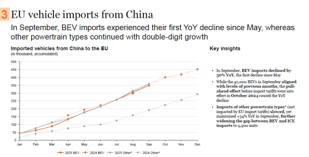 2025年9月,欧盟从中国进口的纯电动汽车(BEV)数量自5月以来首次同比下降,降幅达30%;尽管9月进口量为4.2万辆,与前几个月水平相当,但由于2024年10月欧盟进口关税生效前的“抢运效应”,导致此次同比下降。