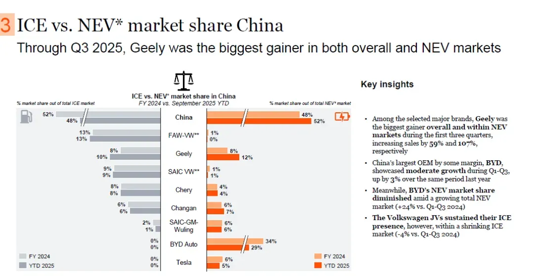 2025年年初至今与2024财年相比,中国内燃机(ICE)汽车市场份额从52%降至48%,新能源汽车(NEV)市场份额从48%升至52%。