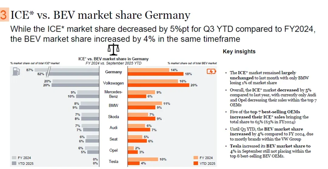 在ICE市场,大众(Volkswagen)2024财年与2025年第三季度年初至今均保持20%的市场份额;奔驰(Mercedes-Benz)保持9%;宝马(BMW)从10%降至9%;斯柯达(Skoda)从9%降至8%;奥迪(Audi)从8%降至7%;西雅特(Seat)保持7%;欧宝(Opel)从6%降至5%。