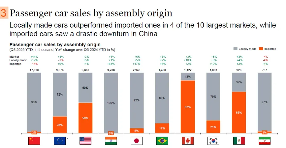 按组装产地划分,在全球10个最大的汽车市场中,有4个市场的本土组装汽车销量表现优于进口汽车;在中国市场,进口汽车销量大幅下滑。