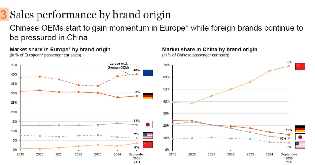 在中国,2019-2025年9月年初至今,中国本土汽车制造商市场份额持续上升,2025年9月年初至今达69%;外国品牌市场份额不断下降,从2019年的较高比例降至2025年9月年初至今的13%左右,外国品牌在中国市场持续面临压力。
