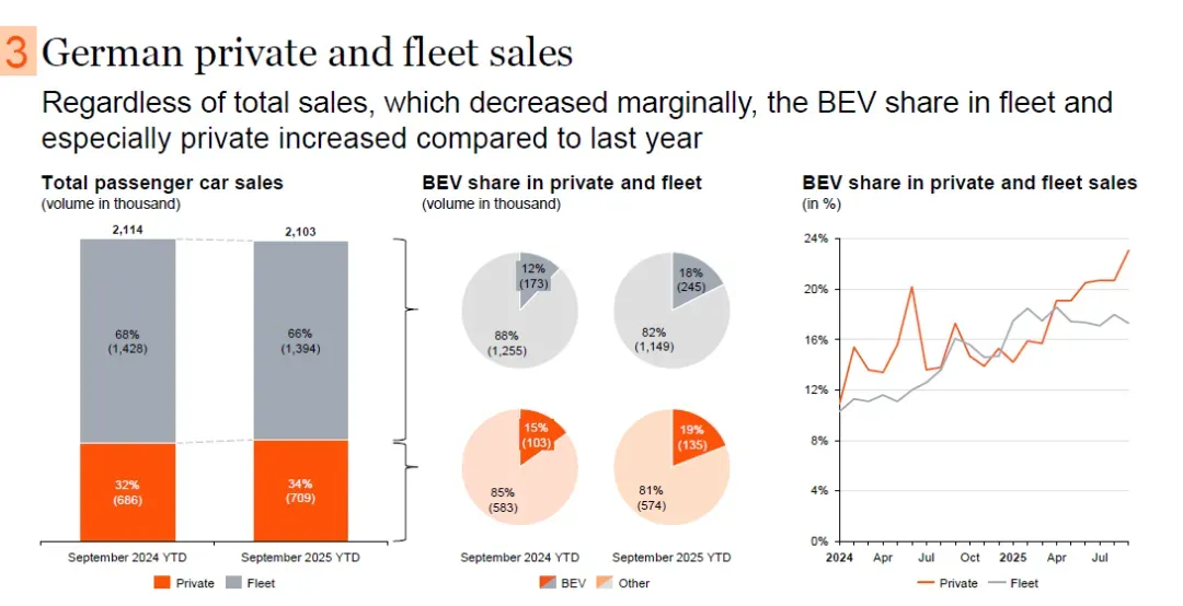 2025年第三季度年初至今与2024财年相比,德国内燃机(ICE)汽车市场份额从87%降至82%,下降5个百分点;纯电动汽车(BEV)市场份额从14%升至18%,增长4个百分点。