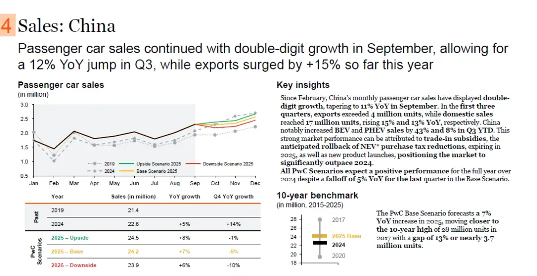 中国汽车市场的强劲表现得益于以旧换新补贴、2025年底到期的新能源汽车(NEV)购置税减免政策即将取消,以及新车型的推出,预计2025年市场将大幅超过2024年水平。普华永道所有情景均预测2025年中国乘用车全年销量将高于2024年,基础情景下第四季度销量同比下降5%